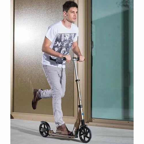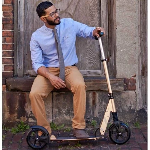 An adjustable handlebar accommodates tall adults and the scooter folds down for easy storage.