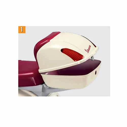The super complete and super accessorised Peg Perego Vespa will guarantee endless fun. The rear-view mirrors have a chrome effect. Located on the handle grips they can be adjusted for the best position. The large headlight reflects the light and looks like it really is on. A glove compartment is located under the handlebar.