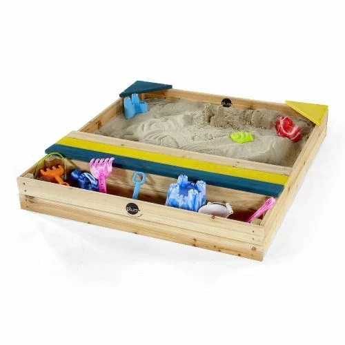 The PlumŸ Store-it Wooden Sand Pit combines traditional outdoor sand play with space for storing buckets and spades!