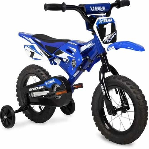This 12” Yamaha Motobike Child’s BMX Bike is ideal for beginners who are still learning to ride. It features training wheels and mini pedals, specially designed for little feet. It also has coaster brakes, knobby tires and a motocross-style seat. This Yamaha Motobike BMX bike is durably constructed with a steel fork, a steel